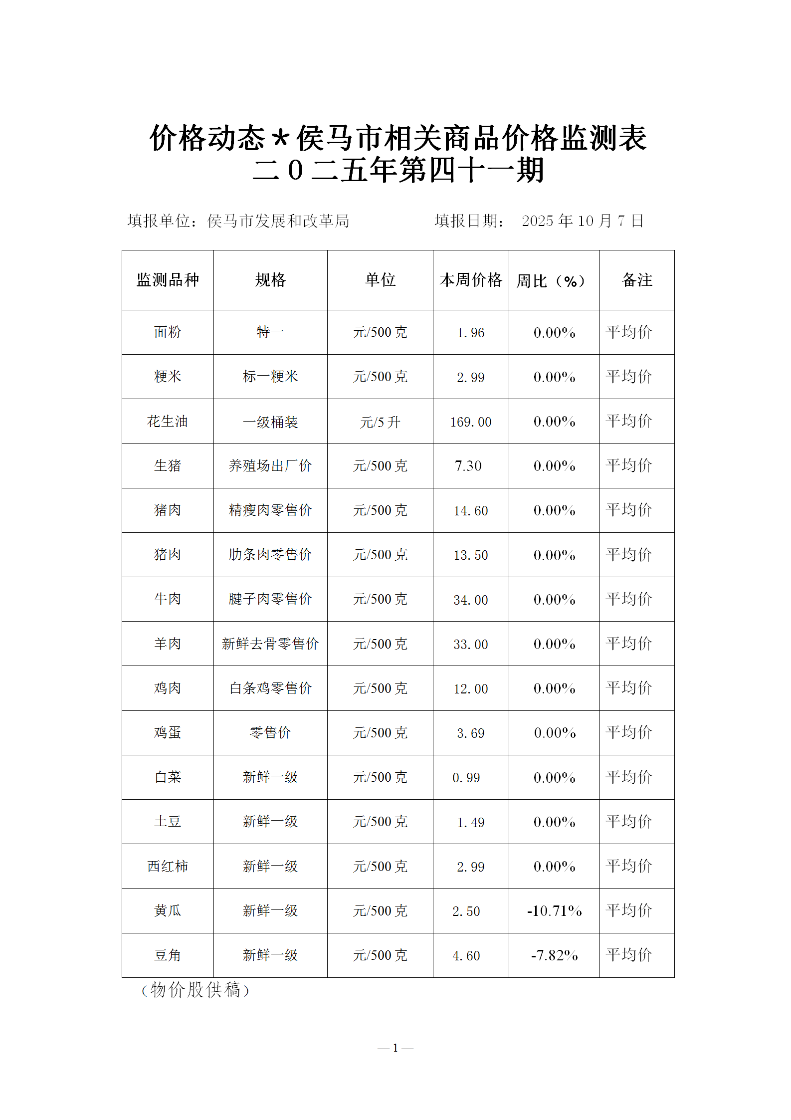 价格动态*侯马市相关商品价格监测表 二O二五年第四十一期