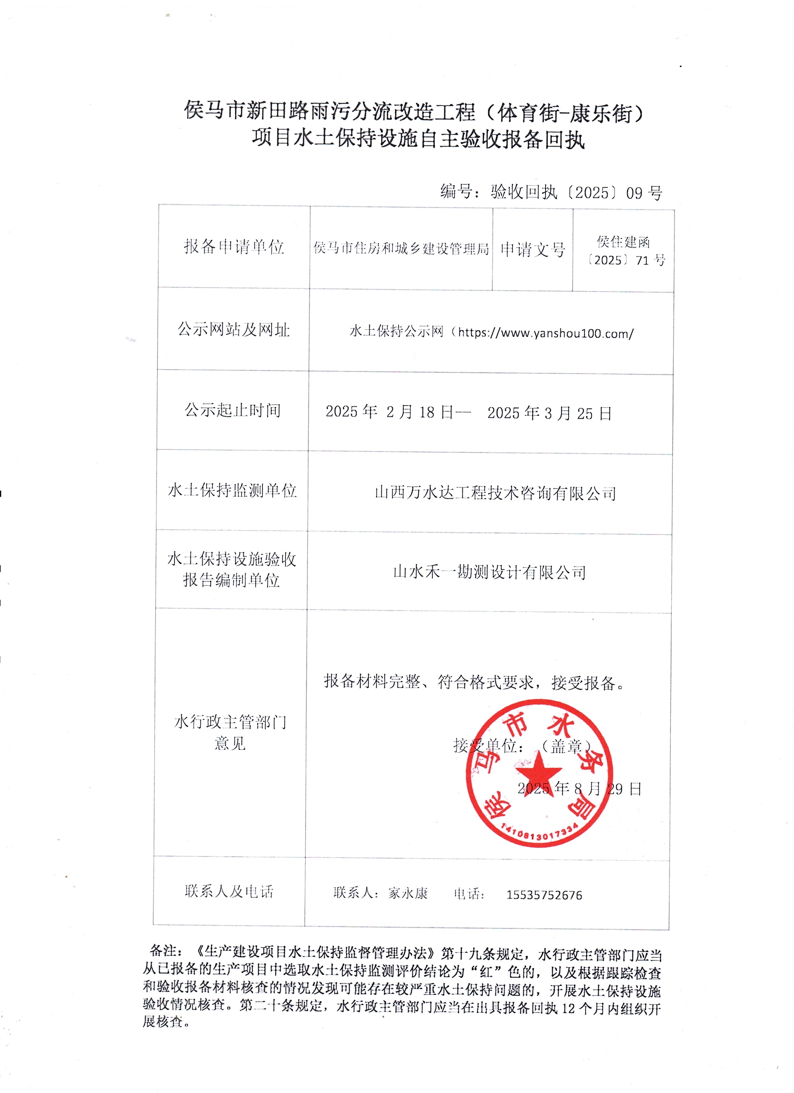 侯马市水务局接受侯马市新田路雨污分流改造工程(体育街—康乐街)项目水土保持设施自主验收报备的公告。