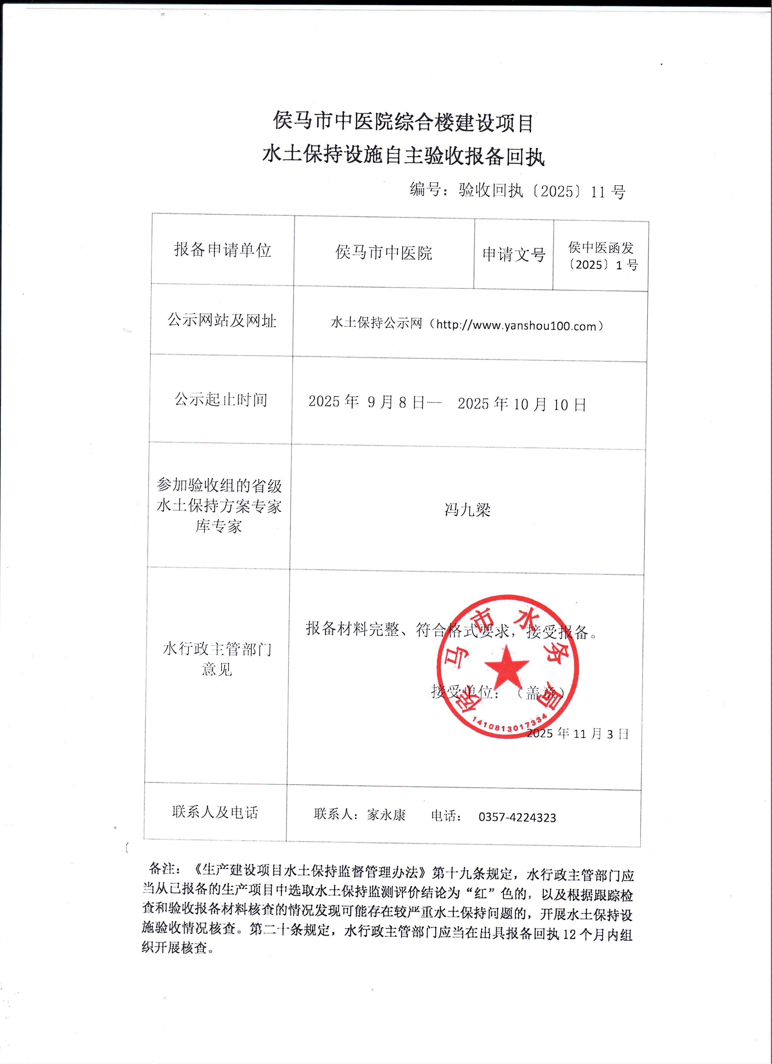 侯马市水务局接受侯马市中医院综合楼建设项目水土保持设施自主验收报备的公告
